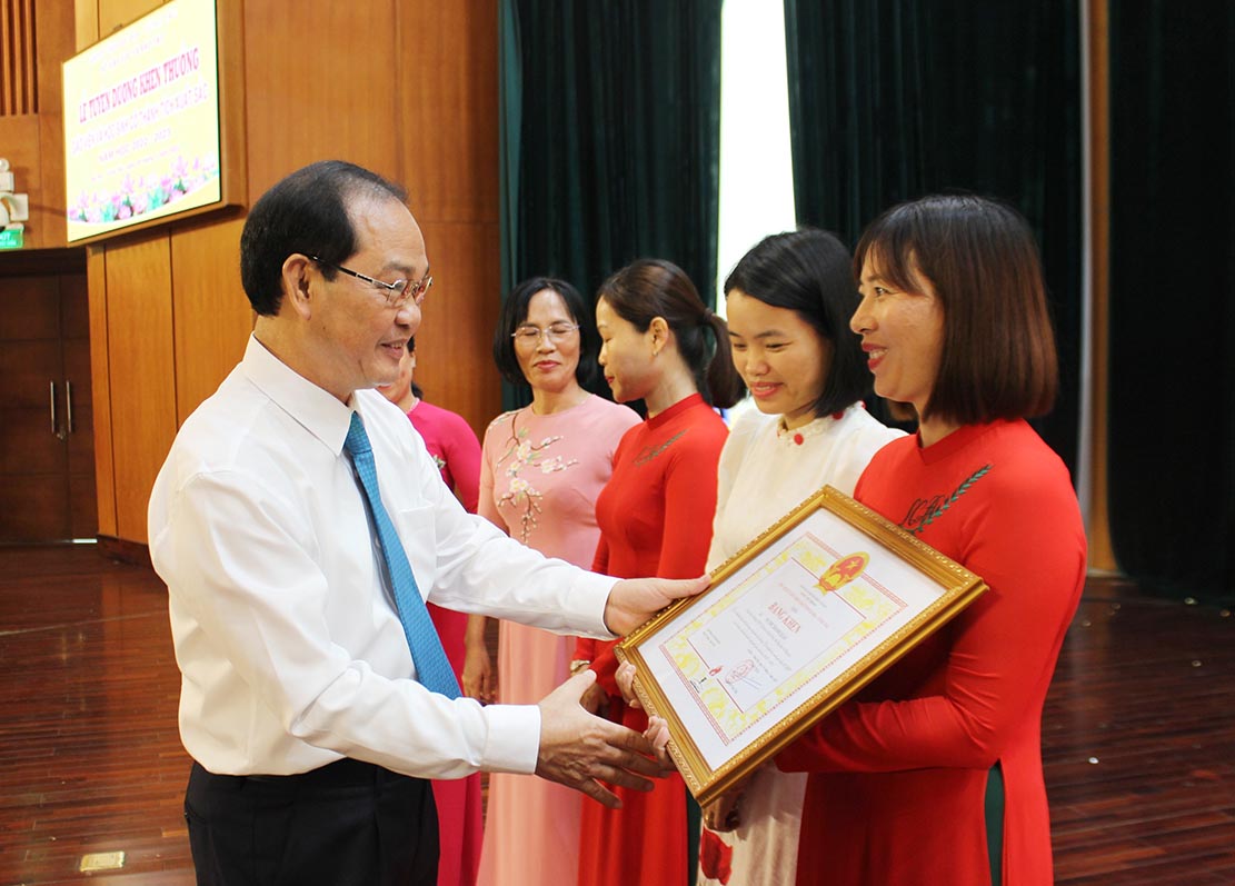 | Ông Mai Ngọc Thuận, Phó Chủ tịch HĐND tỉnh trao Bằng khen của UBND tỉnh cho GV đạt thành tích xuất sắc được tuyên dương tại buổi lễ |