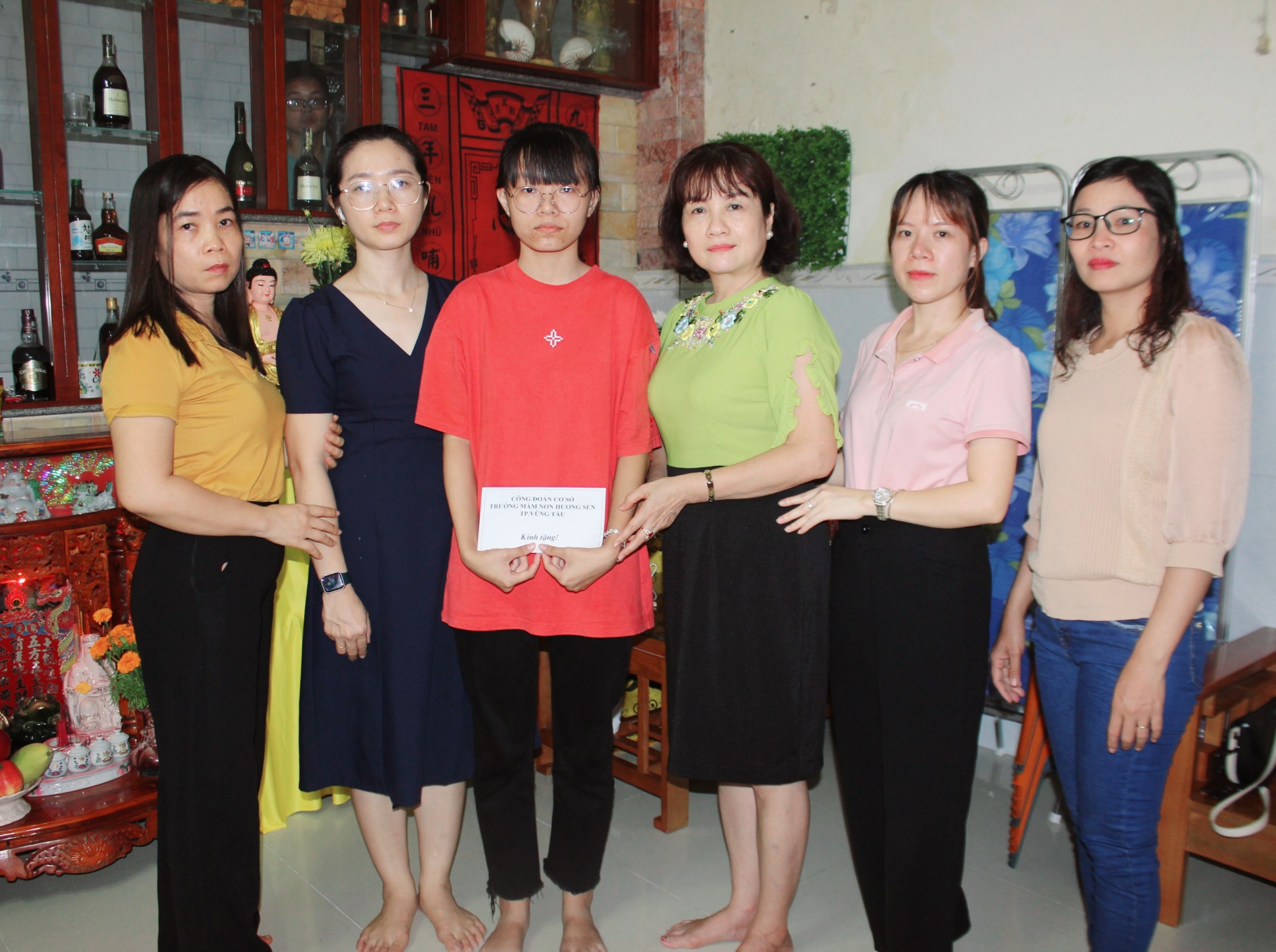 Tại gia đình, Ban Giám hiệu và đại diện Công đoàn Trường MN Hương Sen đã gửi lời chia buồn, động viên tinh thần, đồng thời trao 12 triệu đồng để hỗ trợ các em vượt qua những khó khăn trước mắt.