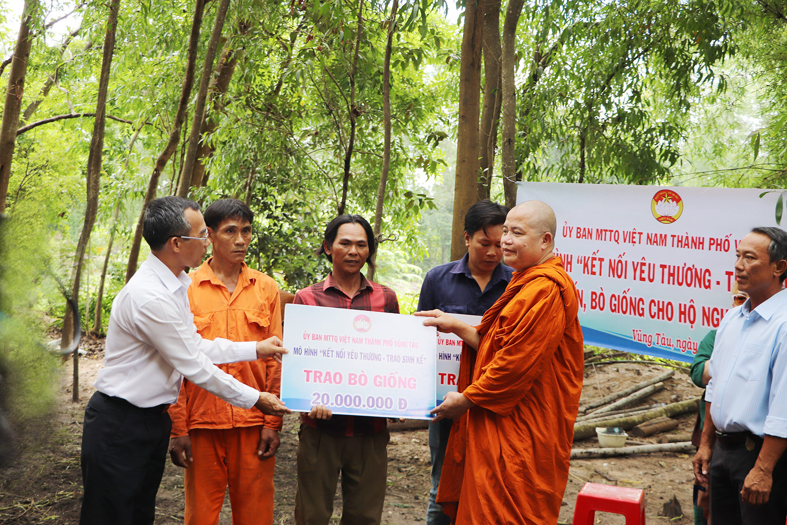 Cụ thể, MTTQ thành phố trao số vốn 7 triệu đồng tới bà Nguyễn Thị Bé (151/5, Hoàng Hoa Thám, phường Thắng Tam) hỗ trợ mua trang thiết bị để bà Bé mở tiệm uốn tóc; hỗ trợ bò sinh sản (trị giá 20 triệu đồng/con) đến 3 gia đình: Nguyễn Văn Hùng, Nguyễn Thành Linh, Nguyễn Thành Tâm (đều ngụ tại xã Long Sơn).
