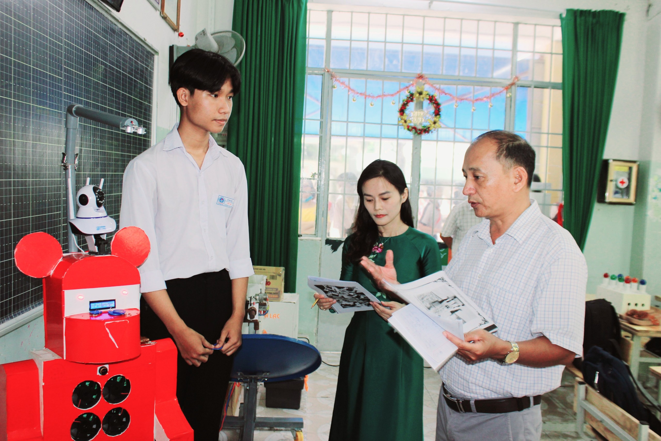 | Thí sinh ở hội đồng THCS thuyết trình sản phẩm và trả lời câu hỏi của Ban Giám khảo. |