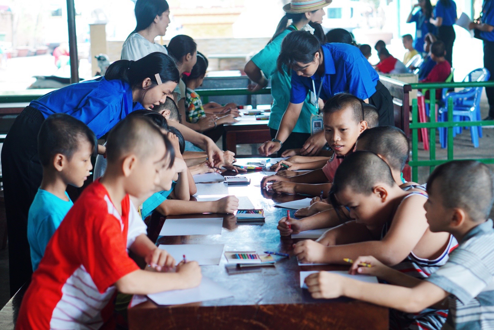 | ĐVTN CLB thiện nguyện hướng dẫn thiếu nhi vẽ tranh. |