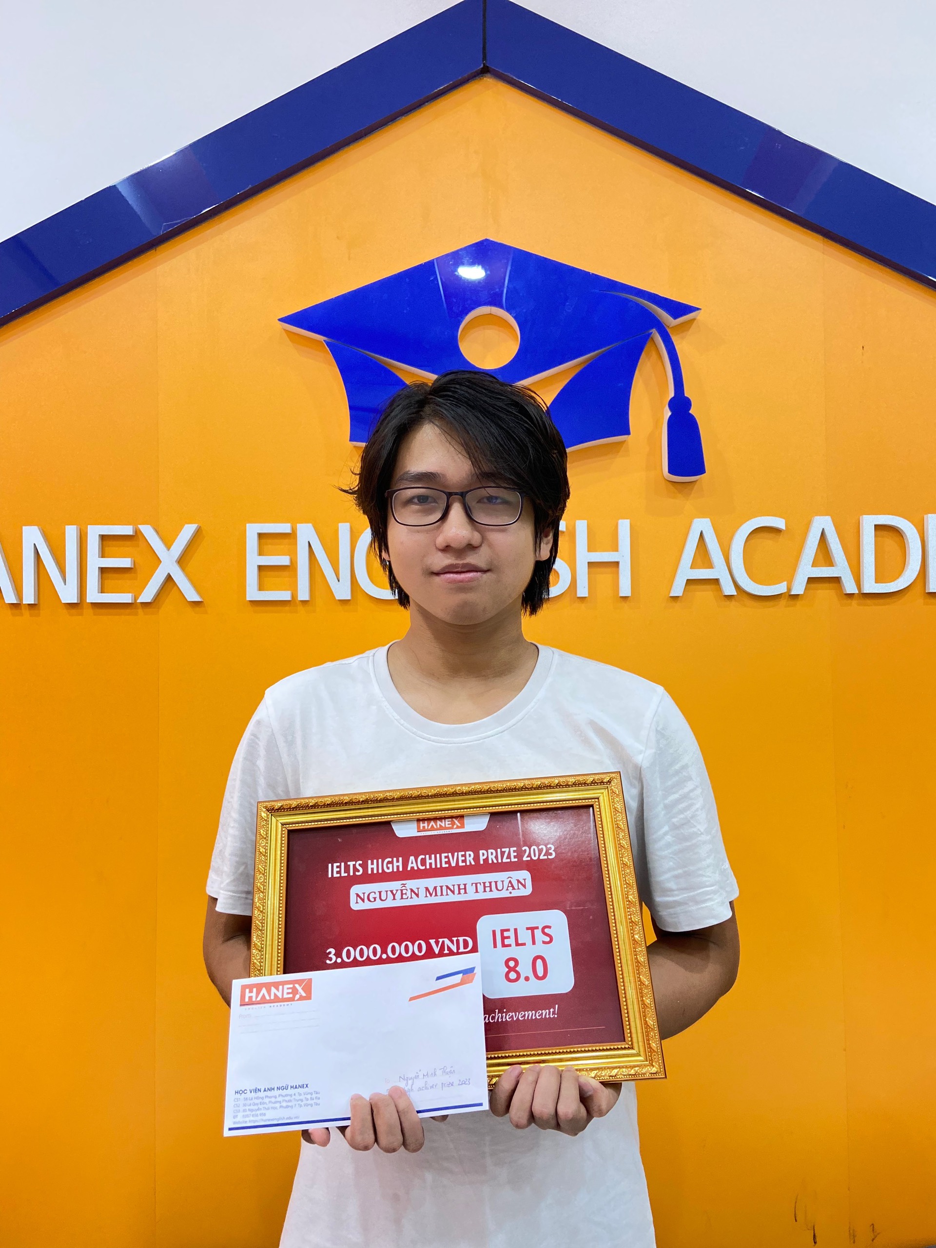 Cuối tháng 6 vừa qua, Trung tâm Ngoại ngữ HANEX đón tin vui: Cậu học trò Nguyễn Minh Thuận (lớp 12 Anh văn 1, Trường THPT chuyên Lê Quý Đôn), học sinh lớp IELTS Intensive tại HANEX đã xuất sắc giành được số điểm ấn tượng 8.0 với hình thức thi IELTS trên máy tính ngay trong lần đầu dự thi. Đặc biệt hơn, ở 2 kỹ năng Reading & Listening (Đọc và Nghe), Thuận đã chinh phục được số điểm tuyệt đối 9.0.