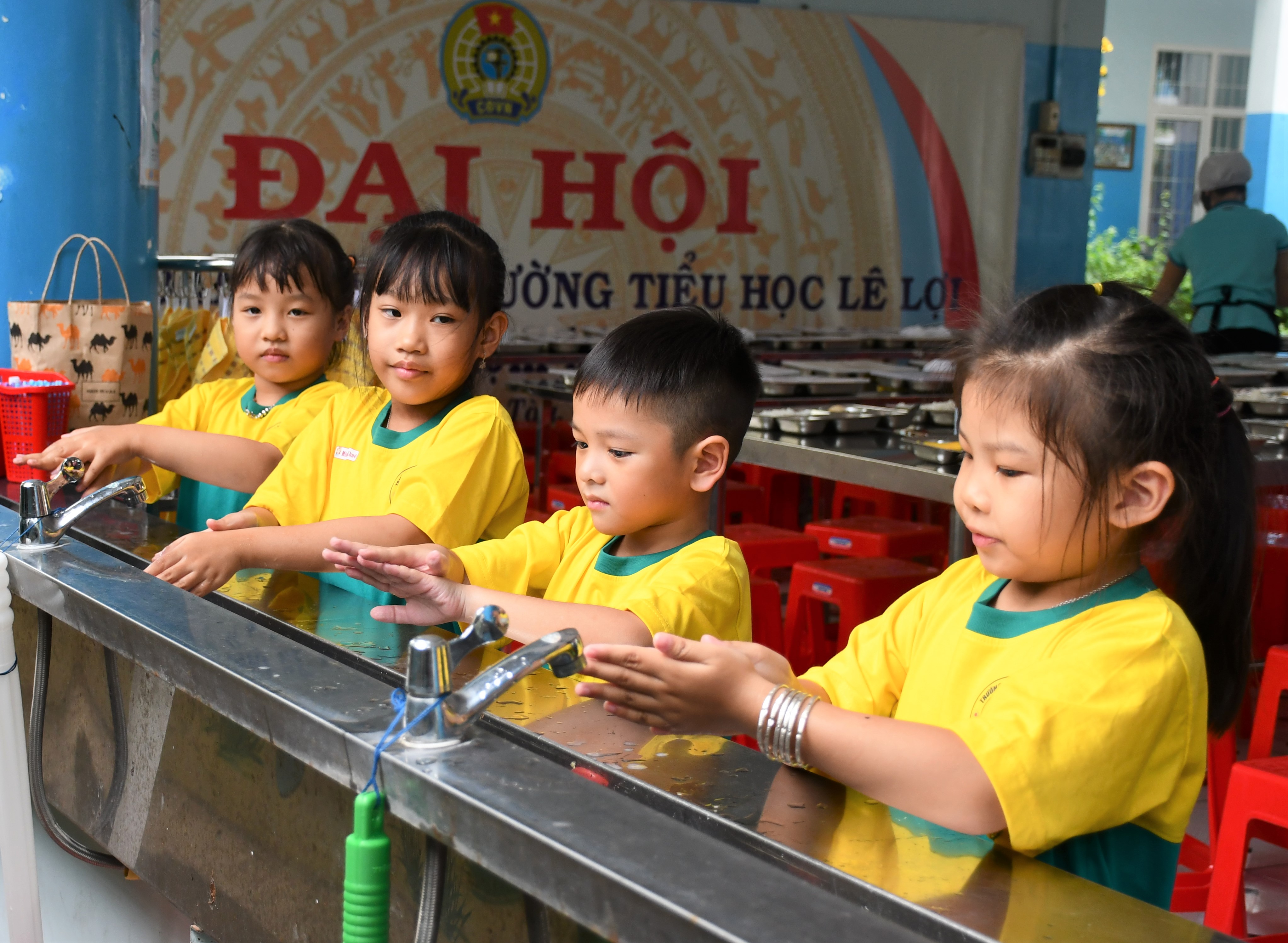 | Thường xuyên rửa tay bằng xà phòng là một trong những biện pháp phòng bệnh TCM. Trong ảnh: HS Trường TH Lê Lợi (TP.Vũng Tàu) rửa tay trước khi ăn trưa. |