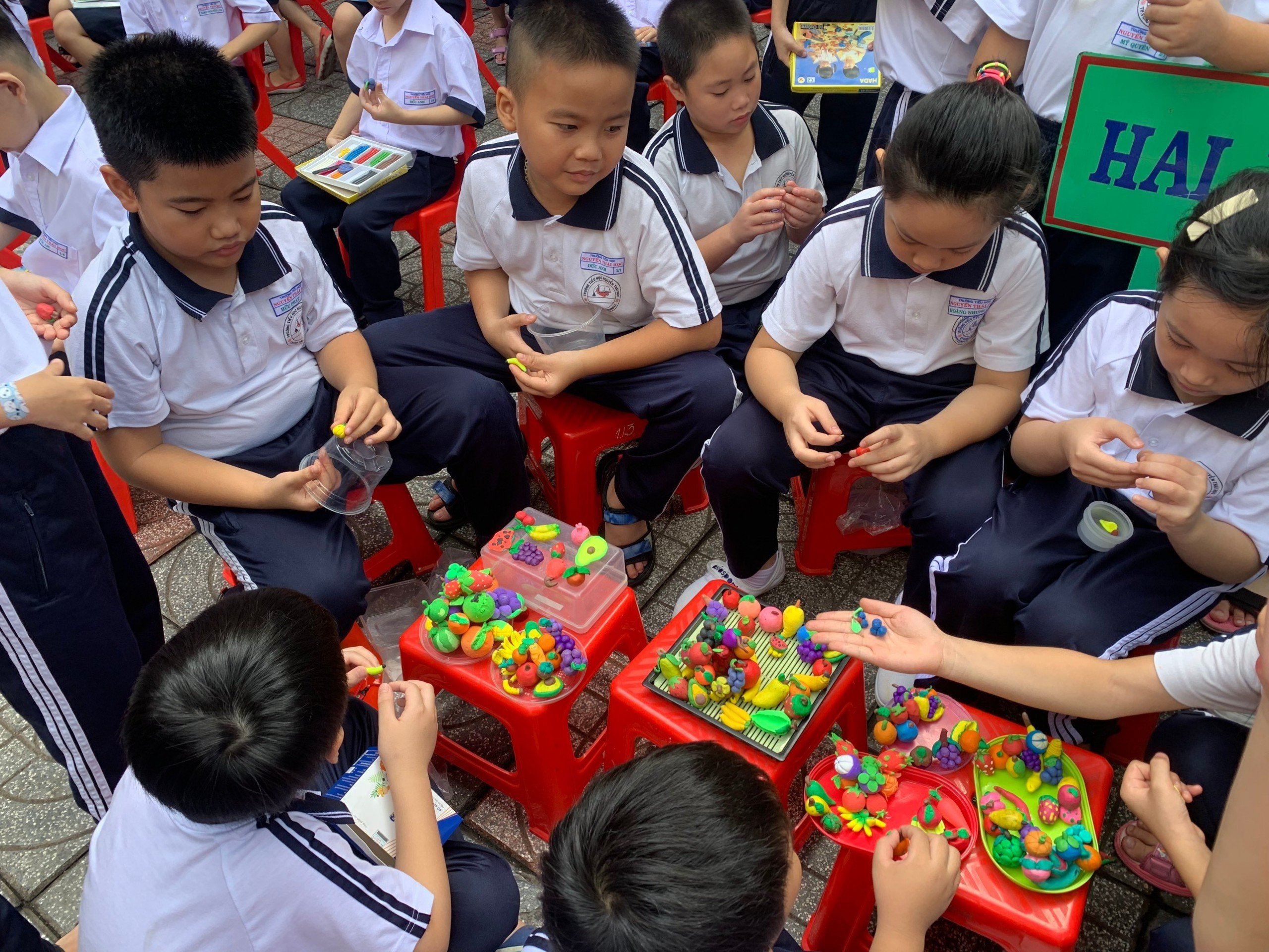 Với chủ đề “Mâm cỗ yêu thương”, dưới sự gợi mở của các thầy cô tổng phụ trách Đội, GV chủ nhiệm, các em HS đã sử dụng “kiến thức nền” của các bộ môn: Toán học, Mĩ thuật, Công nghệ, với chất liệu đất nặn và các vật liệu có sẵn để tạo ra những sản phẩm mâm cỗ Trung thu phù hợp với khả năng của HS mỗi khối lớp.