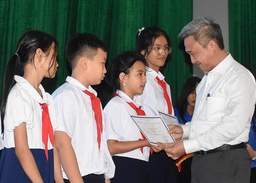 | Ông Đặng Minh Thông, Phó Chủ tịch UBND tỉnh, Trưởng BCĐ Hè tỉnh trao học bổng Doraemon cho học sinh có hoàn cảnh khó khăn. |