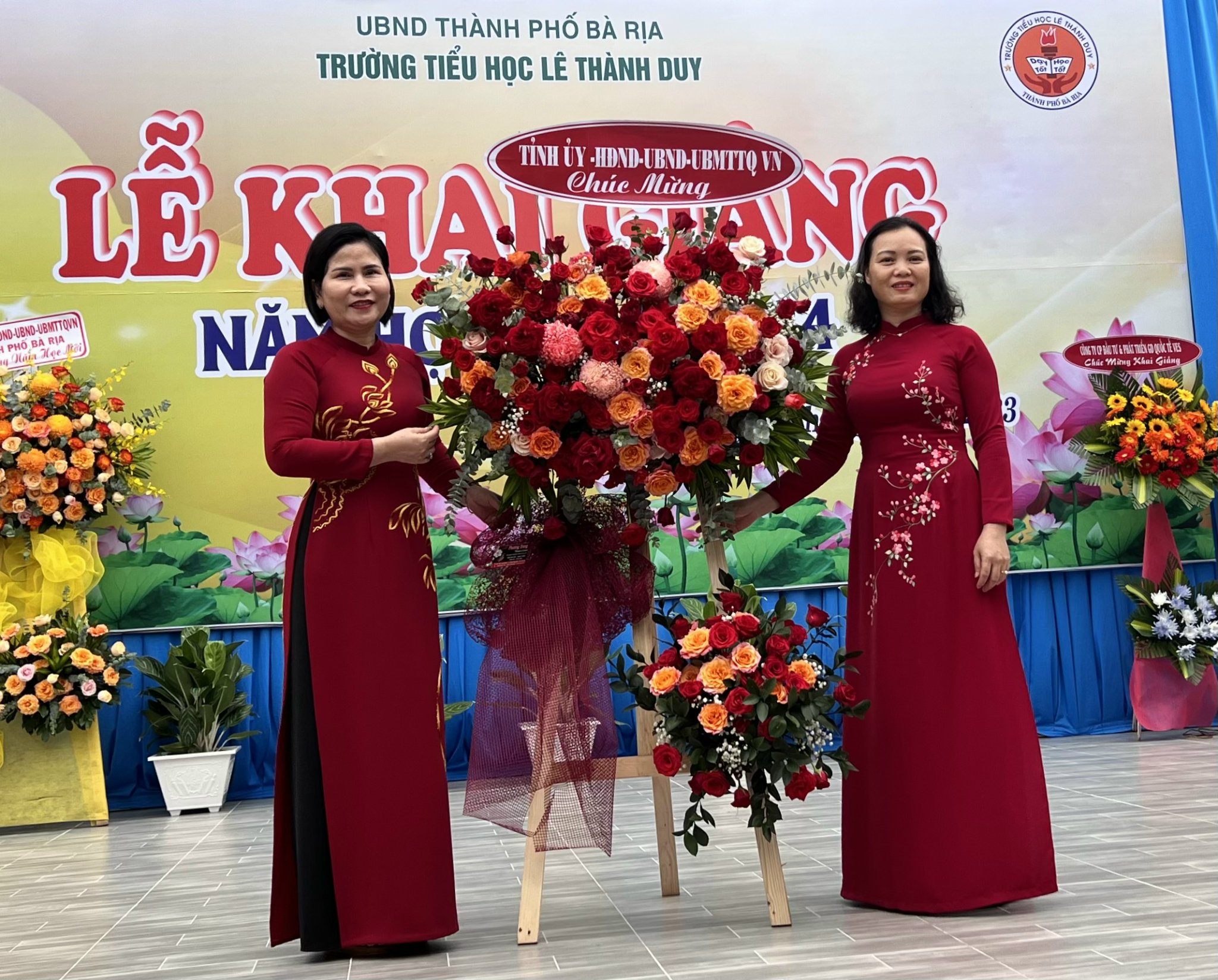 Bà Huỳnh Thị Phúc, Phó Trưởng Đoàn ĐBQH tỉnh tặng hoa chúc mừng Lễ khai giảng năm học mới tại Trường TH Lê Thành Duy (TP.Bà Rịa). Ảnh: TRÚC GIANG.