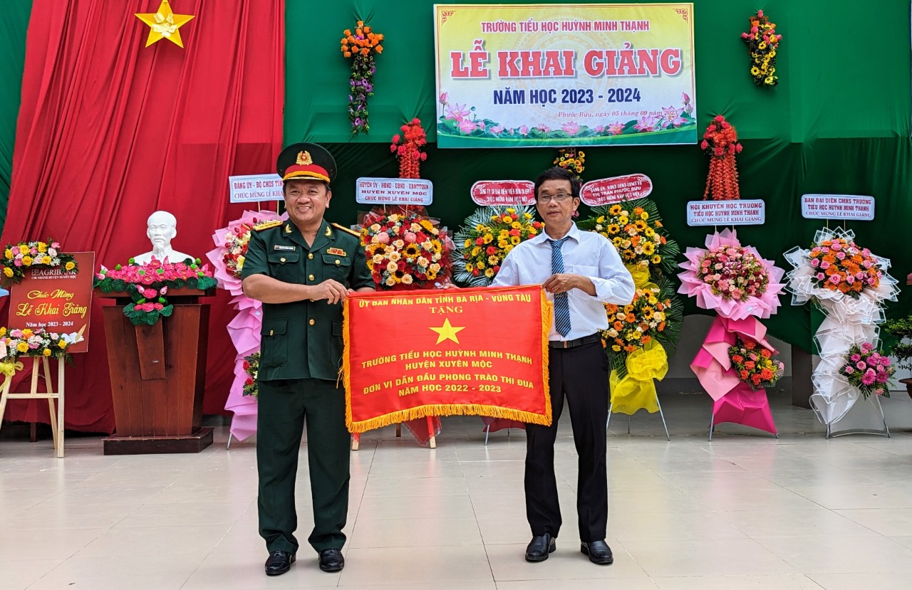 Đại tá Nguyễn Thành Trung, Chính ủy Bộ CHQS tỉnh trao Cờ thi đua của UBND tỉnh cho tập thể Trường TH Huỳnh Minh Thạnh (huyện Xuyên Mộc) nhân dịp khai giảng năm học mới. Ảnh: NHẬT LINH