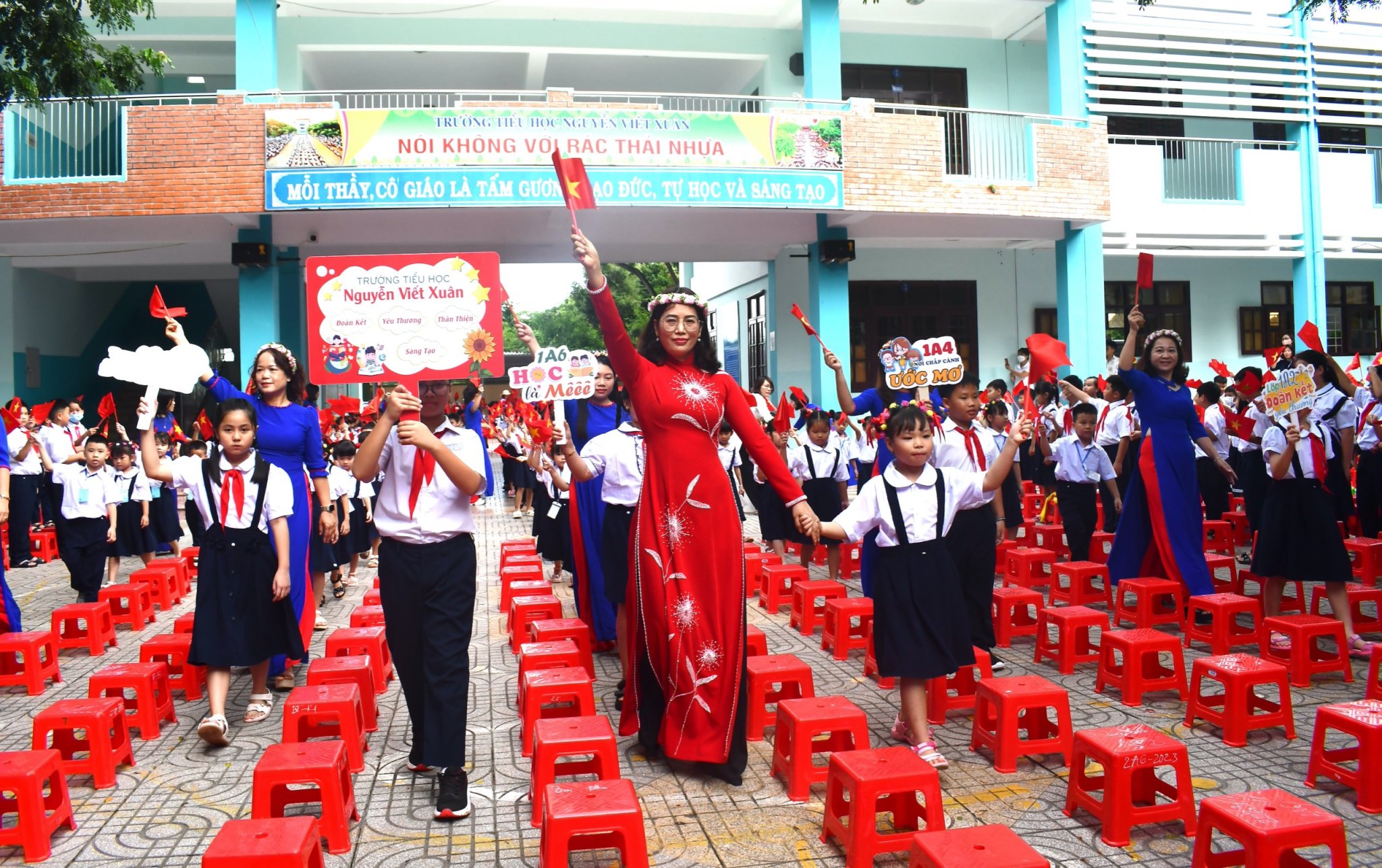 Cô trò Trường TH Nguyễn Viết Xuân (TP.Vũng Tàu) chào đón HS lớp 1 trong lễ khai giảng năm học mới. Ảnh: HUYỀN TRANG.