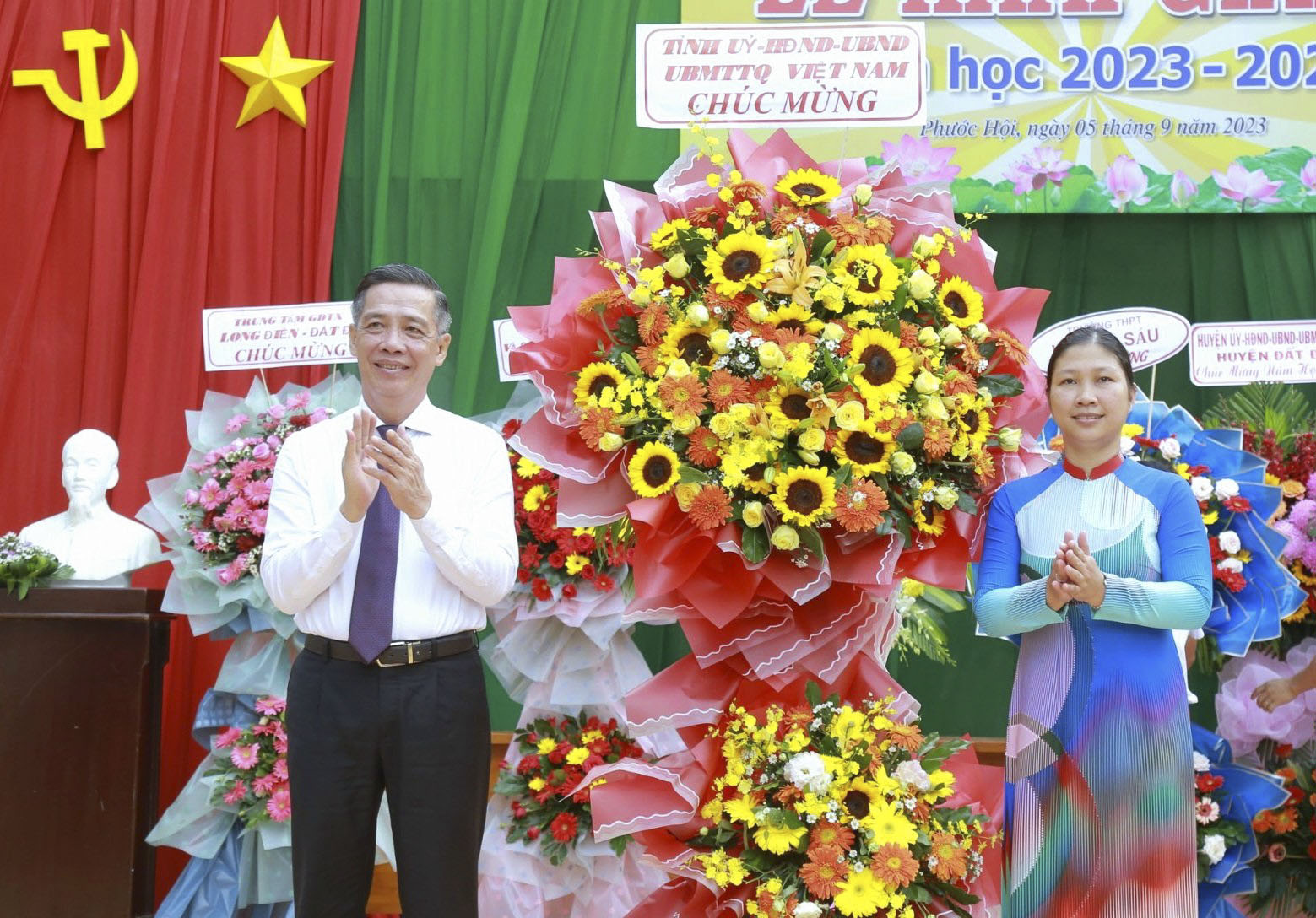 Ông Bùi Chí Thành, Chủ tịch UBMTTQ Việt Nam tỉnh tặng hoa chúc mừng thầy và trò Trường THPT Nguyễn Trãi (huyện Châu Đức) trong lễ khai giảng. Ảnh: ĐINH HÙNG
