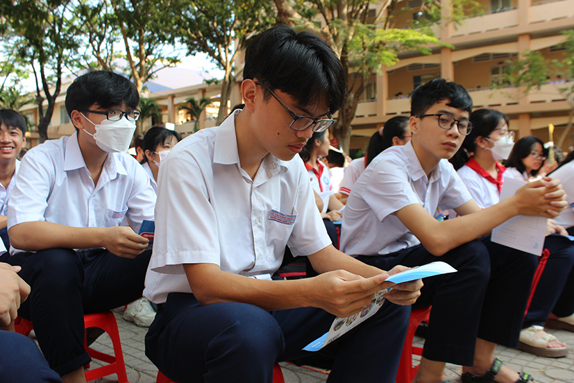 | HS tìm hiểu thông tin về tuyển sinh trong một chương trình hướng nghiệp sau THCS. |