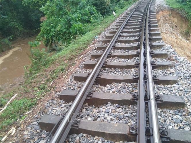 | Do sạt lở nên việc vận hành các tuyến đường sắt Bắc - Nam bị ngưng trệ, ngành đường sắt đã ra thông báo cấm tàu. Ảnh: TTXVN |