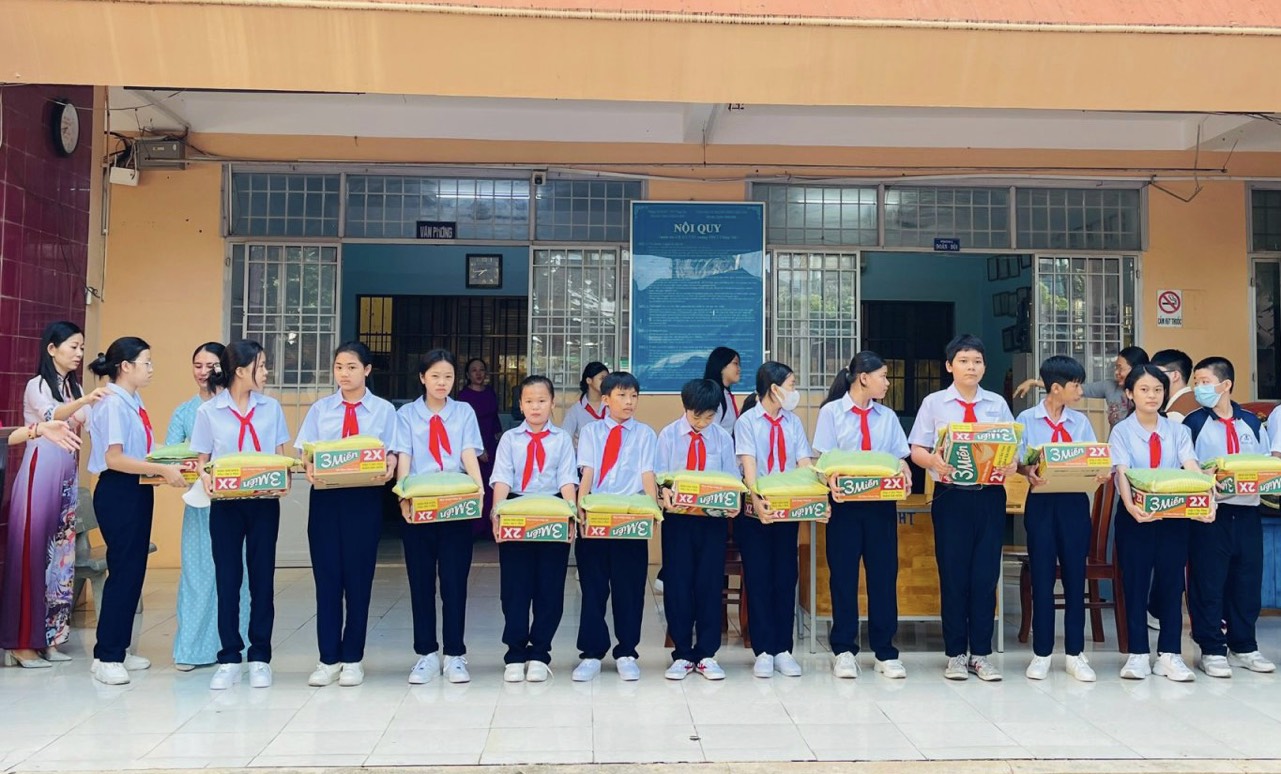 | Học sinh Trường THCS Thắng Nhì được nhận quà từ mô hình “Cha mẹ đỡ đầu: Lắng nghe - Thấu hiểu - Sẻ chia với học sinh cá biệt và có hoàn cảnh khó khăn năm 2023”. |