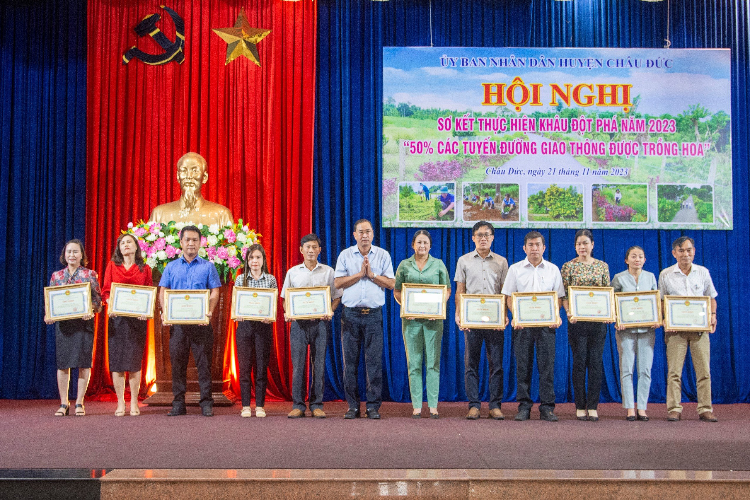 Dịp này, UBND huyện Châu Đức đã trao giấy khen cho 11 tập thể và 25 cá nhân tiêu biểu trong việc thực hiện khâu đột phá “50% các tuyến đường giao thông được trồng hoa” năm 2023; cuộc thi “Tuyến đường hoa kiểu mẫu” năm 2023. Theo đó, tổ phụ nữ 81, thôn Tân Long (xã Kim Long) đã giành giải Nhất “Tuyến đường hoa kiểu mẫu đẹp nhất”.