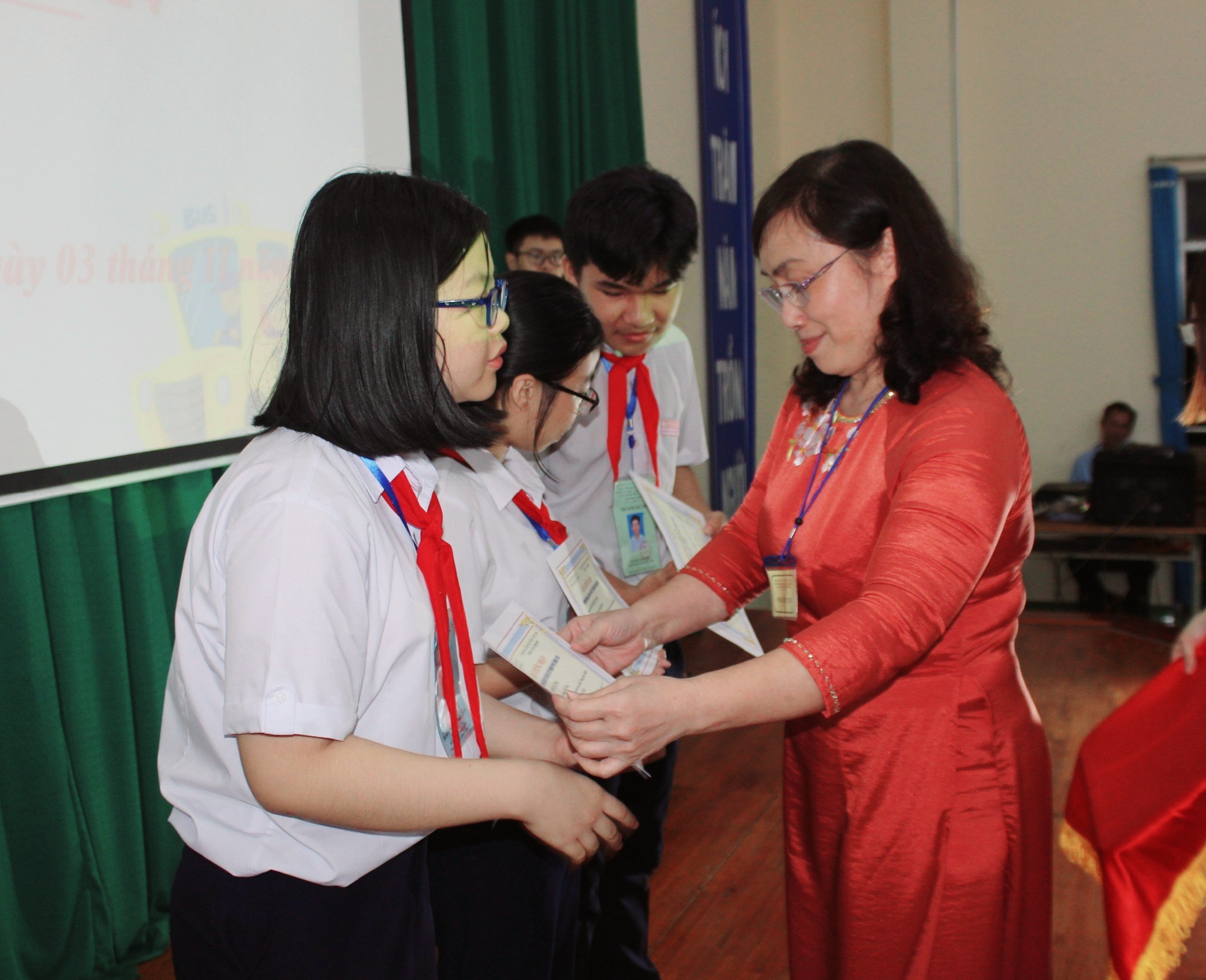 | Bà Nguyễn Thị Mai Liên, Phó trưởng Phòng GD-ĐT trao giải Nhất cho Dự án “Vận dụng năng lực Siêu nhận thức (Metacognition) nhằm nâng cao kết quả học tập cho HS THCS tại TP.Vũng Tàu” của HS Trường THCS Duy Tân. |