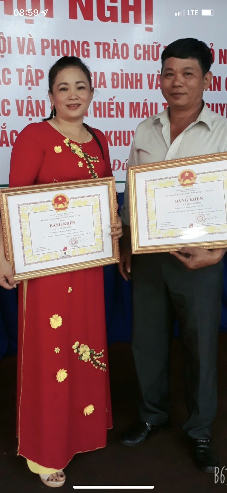 | Vợ chồng anh Hưng-chị Dung đã nhiều lần được khen thưởng vì có nhiều thành tích trong phong trào hiến máu tình nguyện. |