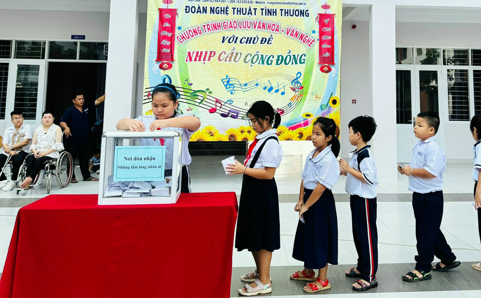 Trong buổi giao lưu, tập thể cán bộ, giáo viên, nhân viên và học sinh Trường Tiểu học Phước An đã được thưởng thức những lời ca, tiếng hát đong đầy cảm xúc đến từ các thầy cô giáo và các em học sinh khuyết tật của Đoàn Nghệ thuật tình thương.
