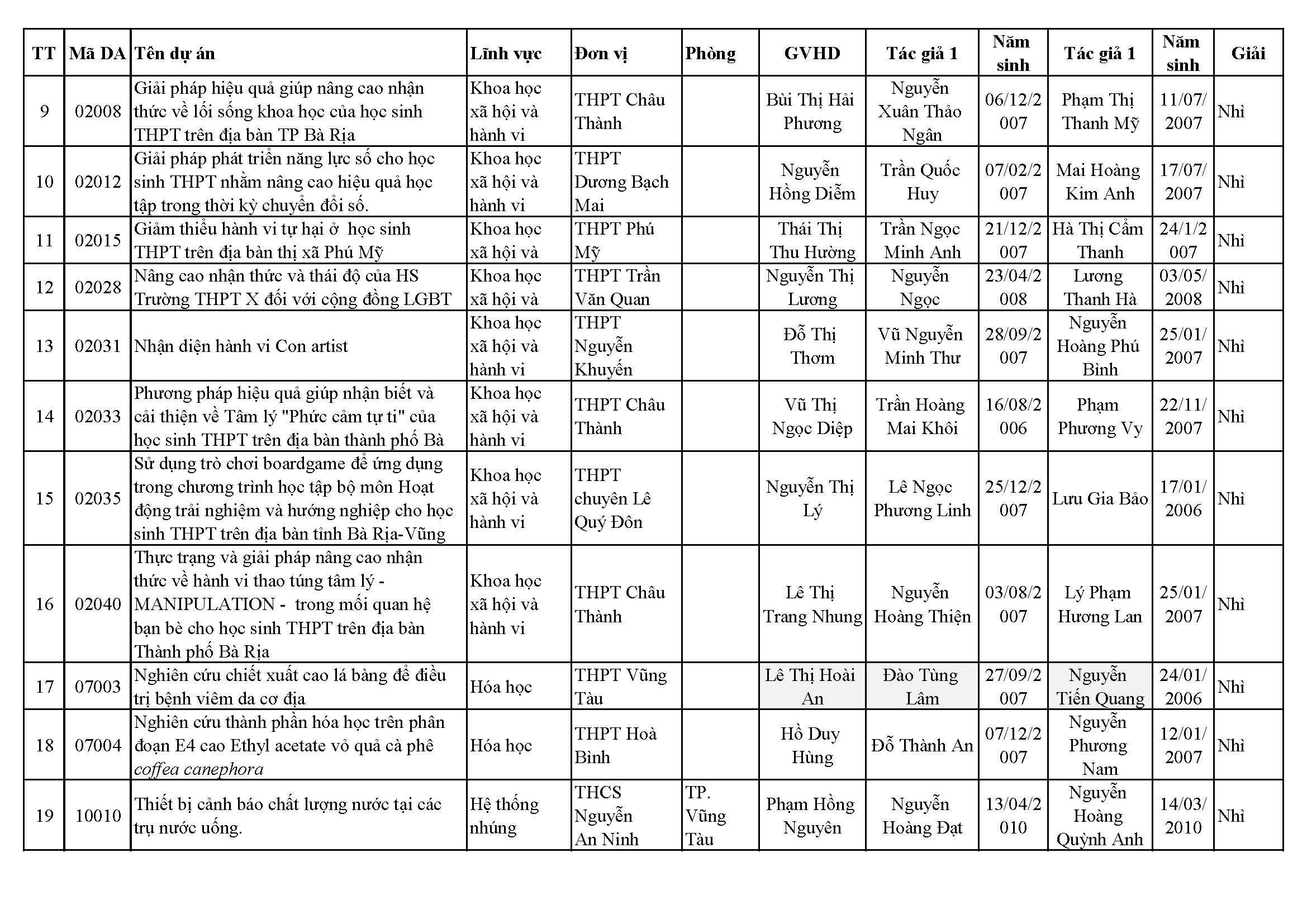 Các dự án đạt giải Nhất gồm: “Xe kéo bình ga” của HS Nguyễn Phúc Tuấn Tú, Nguyễn Quốc Trí, Trường THPT Nguyễn Trãi; “Thiết bị tự nấu cơm tự động cho gia đình” của em Trần Quốc Vương, HS Trường THPT Ngô Quyền (cùng huyện Châu Đức); “Thiết bị hỗ trợ học tập đa năng cho HS khiếm thị hoà nhập cộng đồng” của em Huỳnh Nguyễn Minh Đạt, Trường THCS Nguyễn Du (TP. Bà Rịa); “Thiết bị an toàn, cảnh báo khẩn cấp và hỗ trợ tìm kiếm ngư dân gặp nạn khi làm việc trên thúng” của em Lê Thành Đạt, Phạm Bùi Thanh Sang, HS Trường THPT Trần Văn Quan (huyện Long Điền); “Khảo sát khả năng ức chế nảy mầm hạt và hoạt tính kháng vi khuẩn gây bệnh trên cá của cao chiết lá bàng” của em Nguyễn Minh Triết và Hoàng Thuỳ Dương, HS Trường THPT Trần Nguyên Hãn; “Thiết kế website hỗ trợ hoạt động dạy và học môn Giáo dục địa phương tại tỉnh Bà Rịa - Vũng Tàu” của em Bùi Tấn Phát và Nguyễn Hoàng Minh, HS Trường THPT Vũng Tàu(cùng TP. Vũng Tàu); “Quảng bá hình ảnh Đất Đỏ giàu bản sắc thông qua thiết kế video, bài viết đăng tải trên các trang mạng xã hội, tìm hiểu lịch sử, văn hoá, danh lam thắng cảnh và thành tựu kinh tế xã hội của địa phương qua góc nhìn của thiếu nhi” của em Lương Nguyễn Hiền Trinh, HS Trường THCS Đất Đỏ (huyện Đất Đỏ).