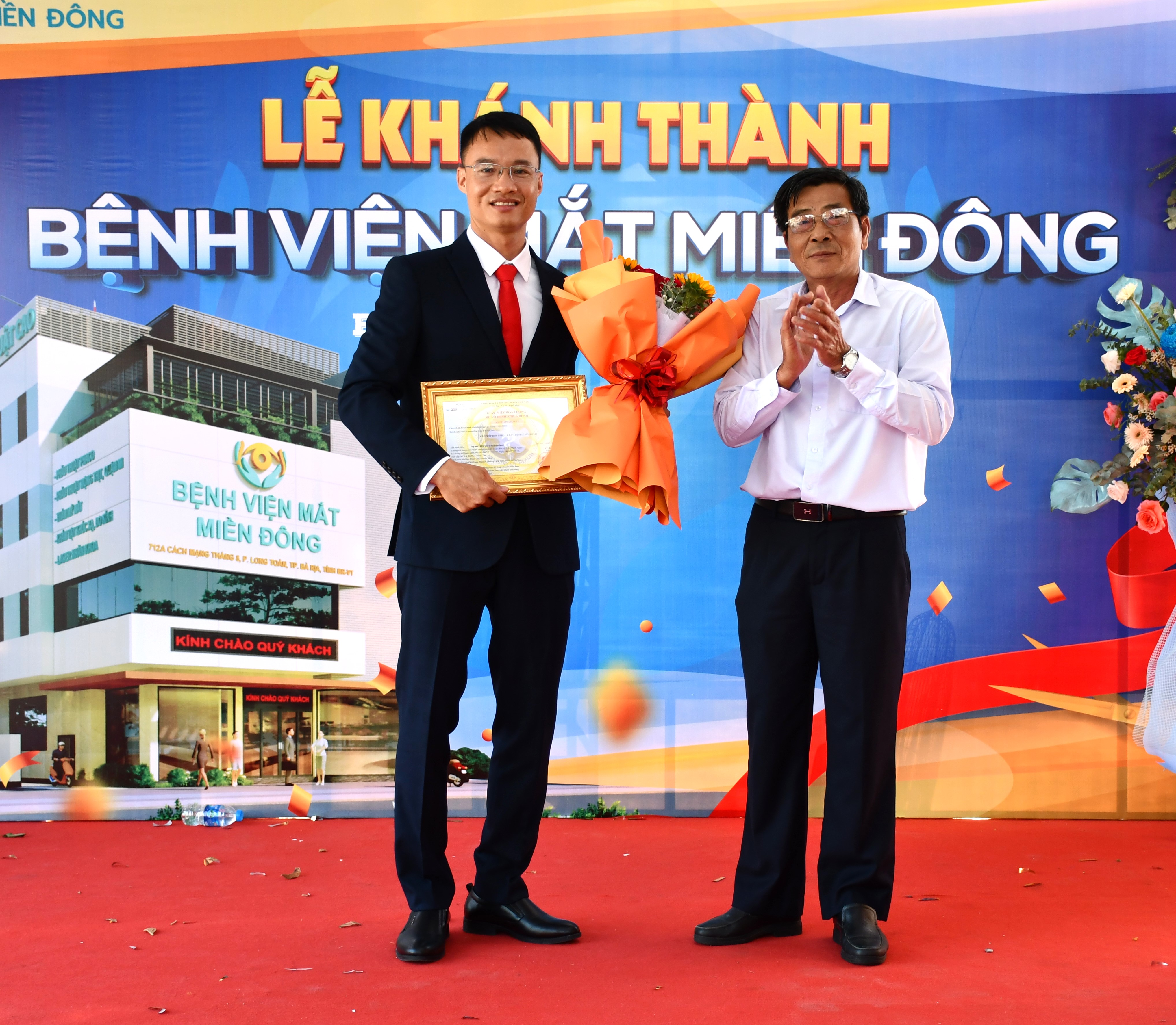 | Bác sĩ Nguyễn Văn Thái, Phó Giám đốc Sở Y tế trao Giấy phép hoạt động khám, chữa bệnh của Bộ Y tế cho lãnh đạo Bệnh viện Mắt Miền Đông |