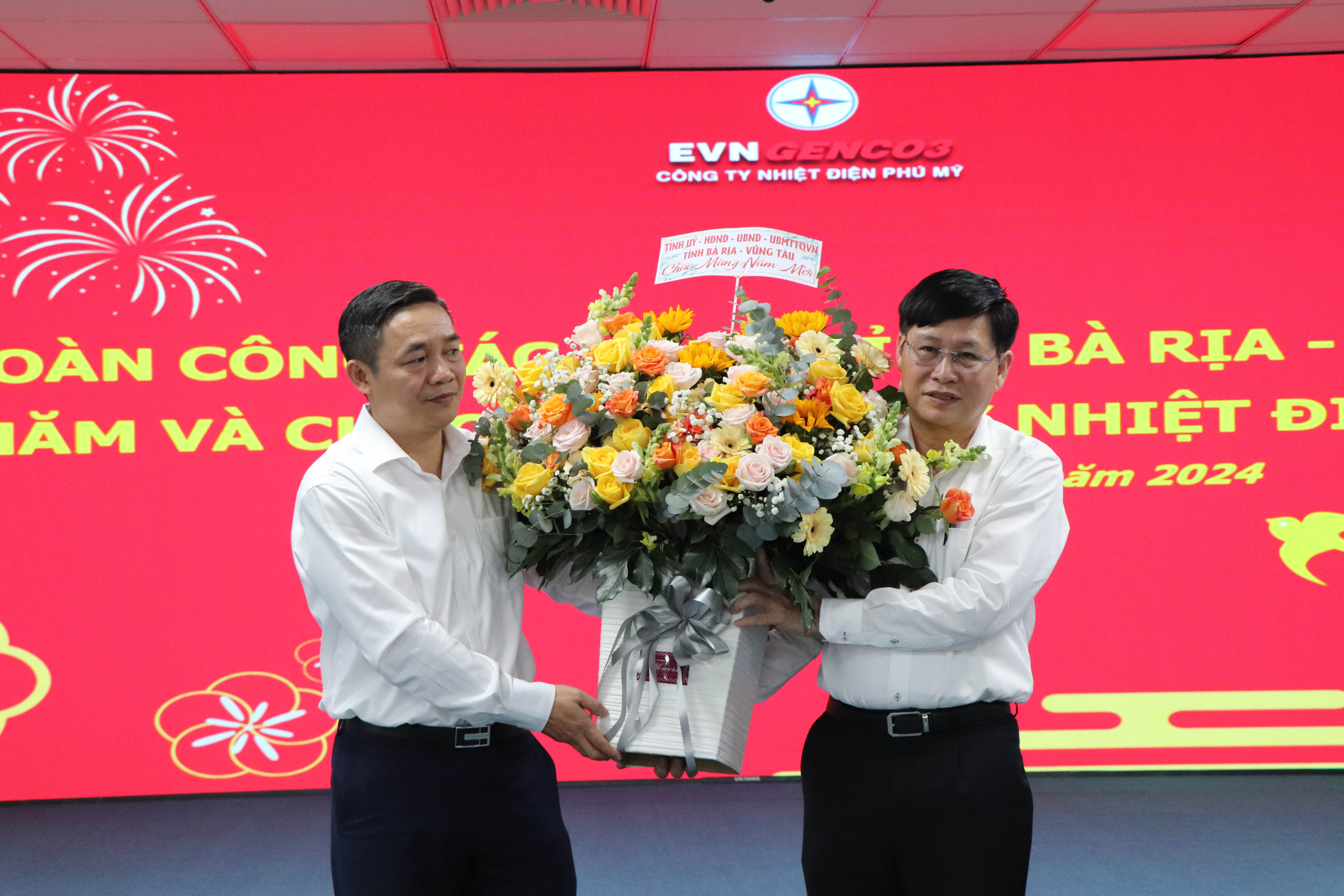 | Phó Chủ tịch UBND tỉnh Lê Ngọc Khánh (bên phải), tặng hoa và chúc Tết Công ty Nhiệt điện Phú Mỹ. |
