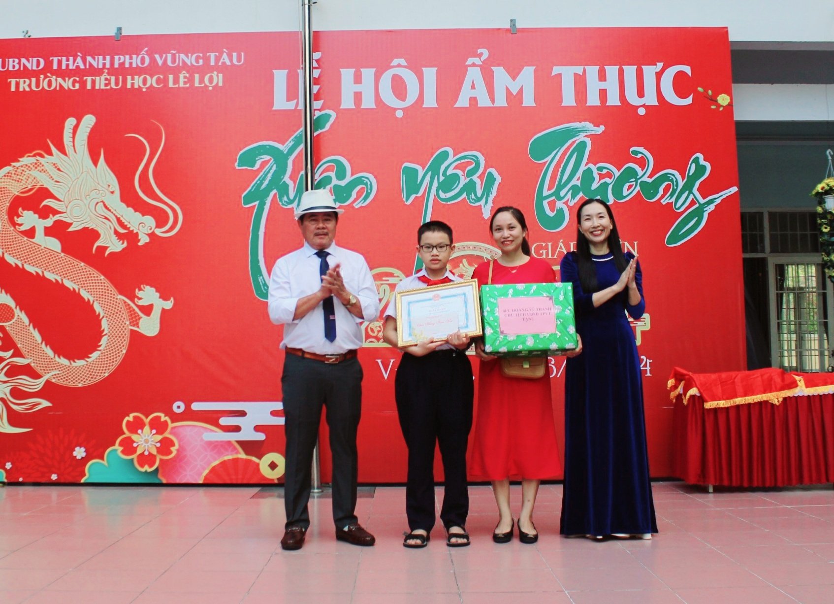 | Ban Giám hiệu Trường TH Lê Lợi (TP.Vũng Tàu) trao quà của Chủ tịch UBND thành phố cho em Lê Nguyễn Minh Khang. |