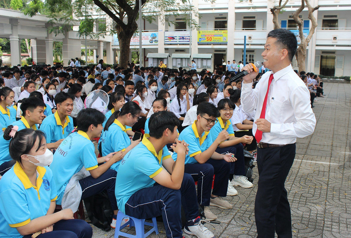 | TS. Vũ Xuân Hướng, Trưởng Khoa Ngoại ngữ - Khoa học xã hội, Trưởng ngành Tâm lý học (Trường ĐH Bà Rịa-Vũng Tàu) tư vấn, định hướng ngành nghề cho HS Trường THPT Trần Phú (huyện Châu Đức) trong chương trình "Đánh thức khát vọng và định hướng nghề nghiệp". |