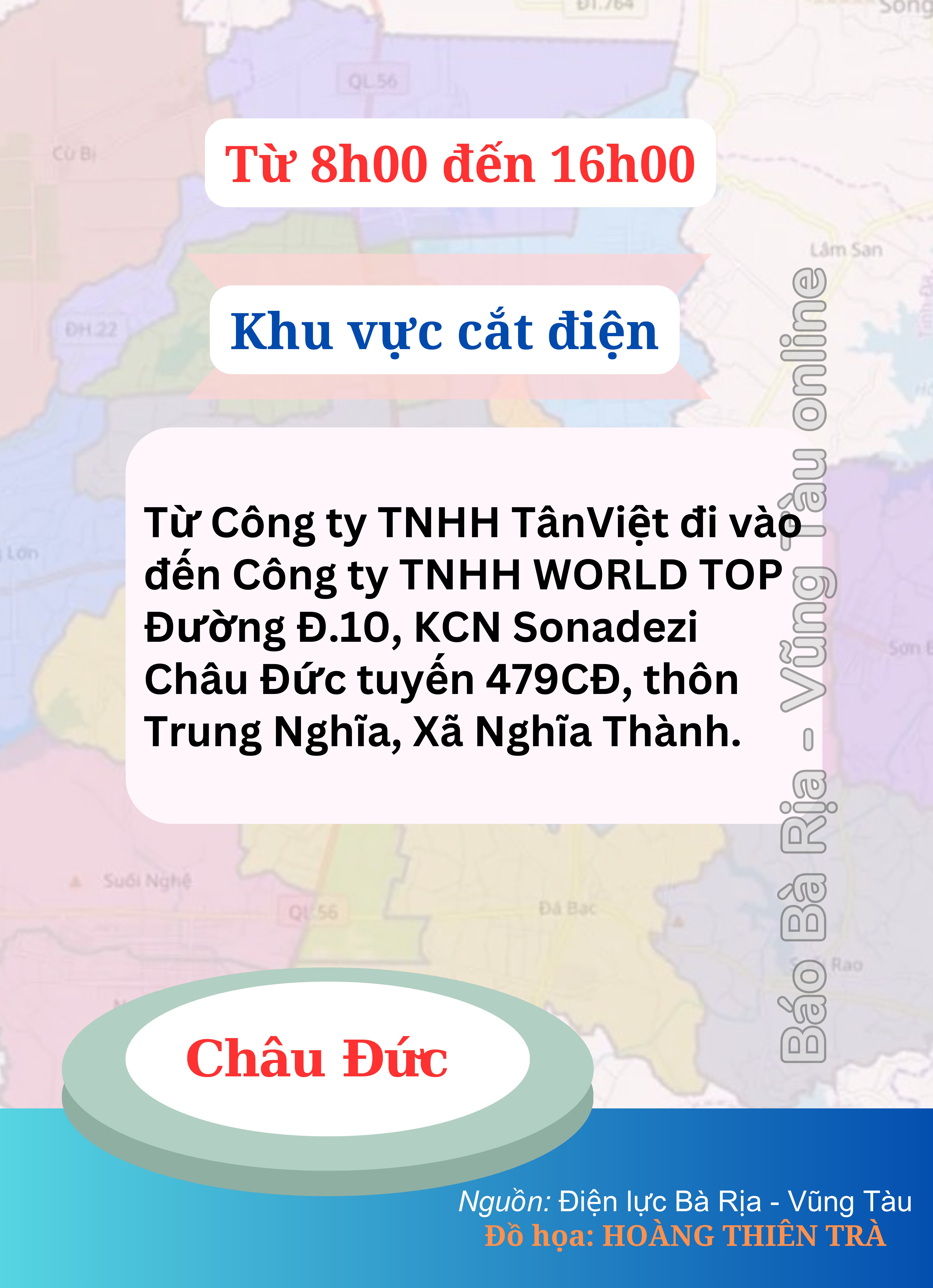 Công ty Điện lực BR-VT dự kiến tạm ngừng cấp điện để bảo trì và sửa chữa lưới điện tại địa bàn huyện Châu Đức vào ngày 12/5.