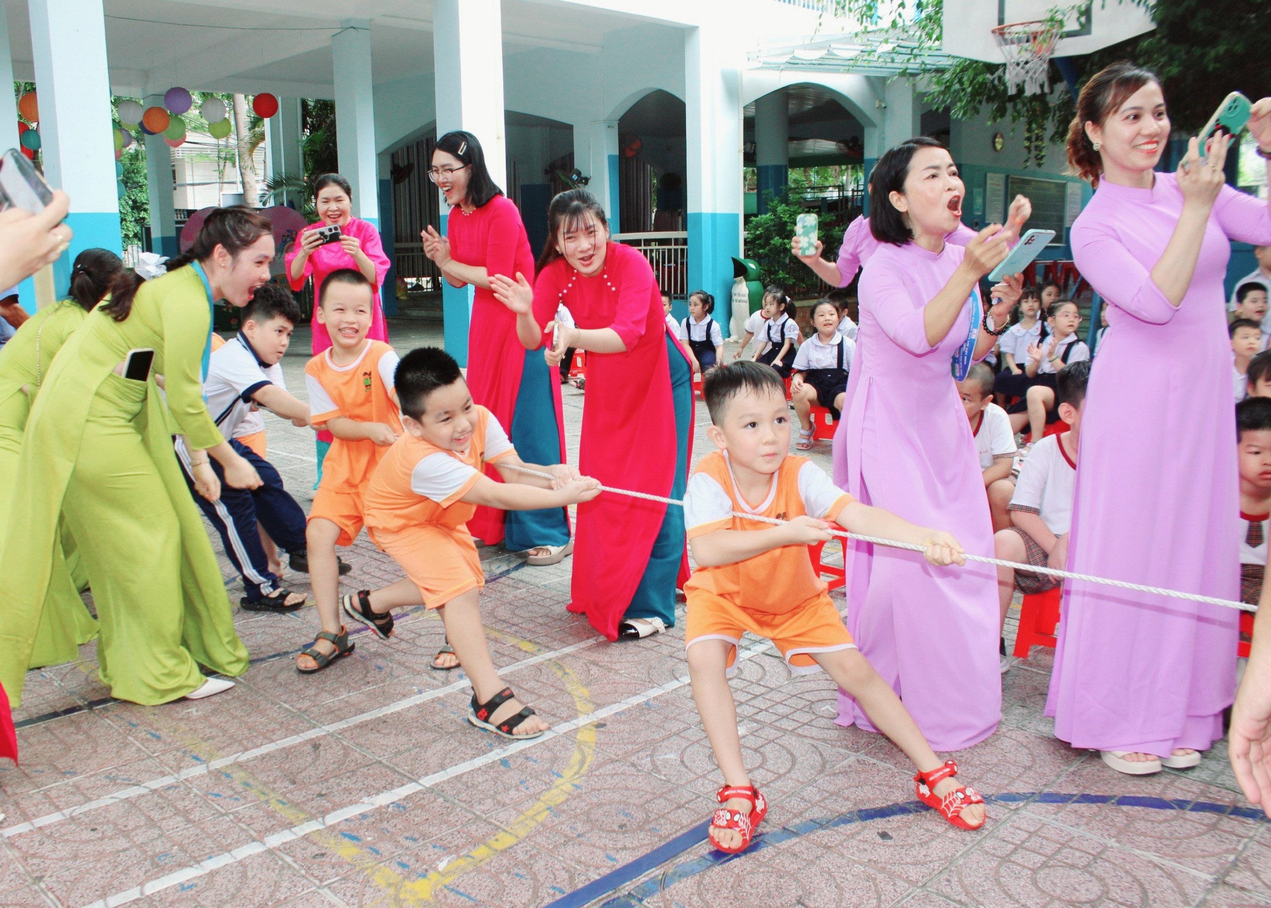 Trong chương trình, HS của 2 trường MN được xem video giới thiệu về các hoạt động của nhà trường, giao lưu văn nghệ, tham gia các trò chơi vận động như kéo co, nhảy tập thể... cùng HS, GV Trường TH Lê Lợi.
