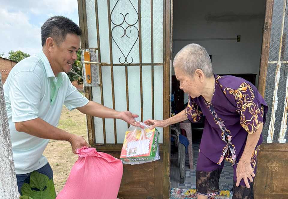 | Ông Phan Anh Thuận, Trưởng Nhóm thiện nguyện xã Bông Trang trao quà cho bà Ngô Thị Chén (SN 1928, ấp Trang Hoàng, xã Bông Trang), người già neo đơn. Ảnh: NVCC |