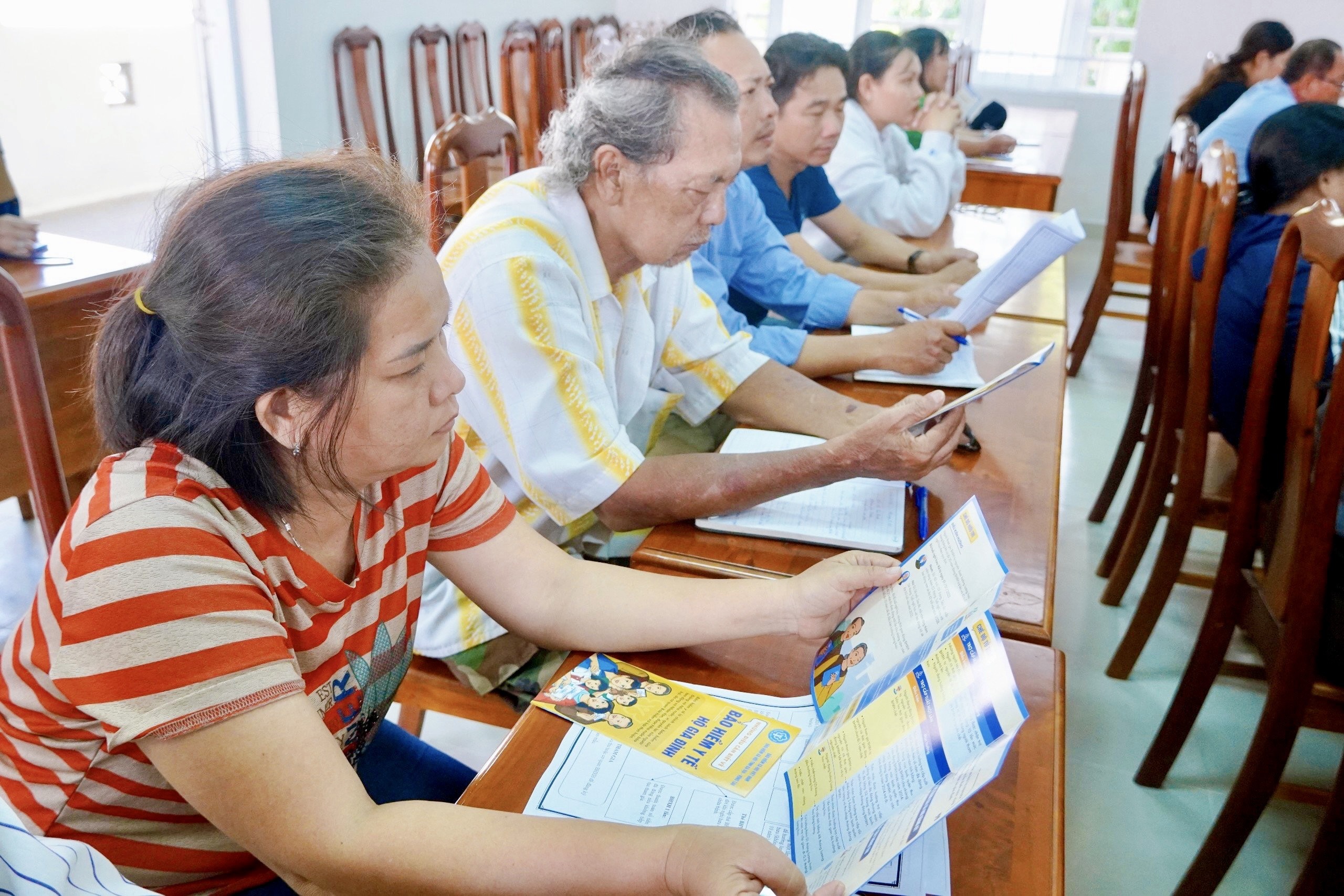 | Hội viên nông dân huyện Long Điền tham khảo tờ rơi về chính sách BHXH tự nguyện, BHYT hộ gia đình. |