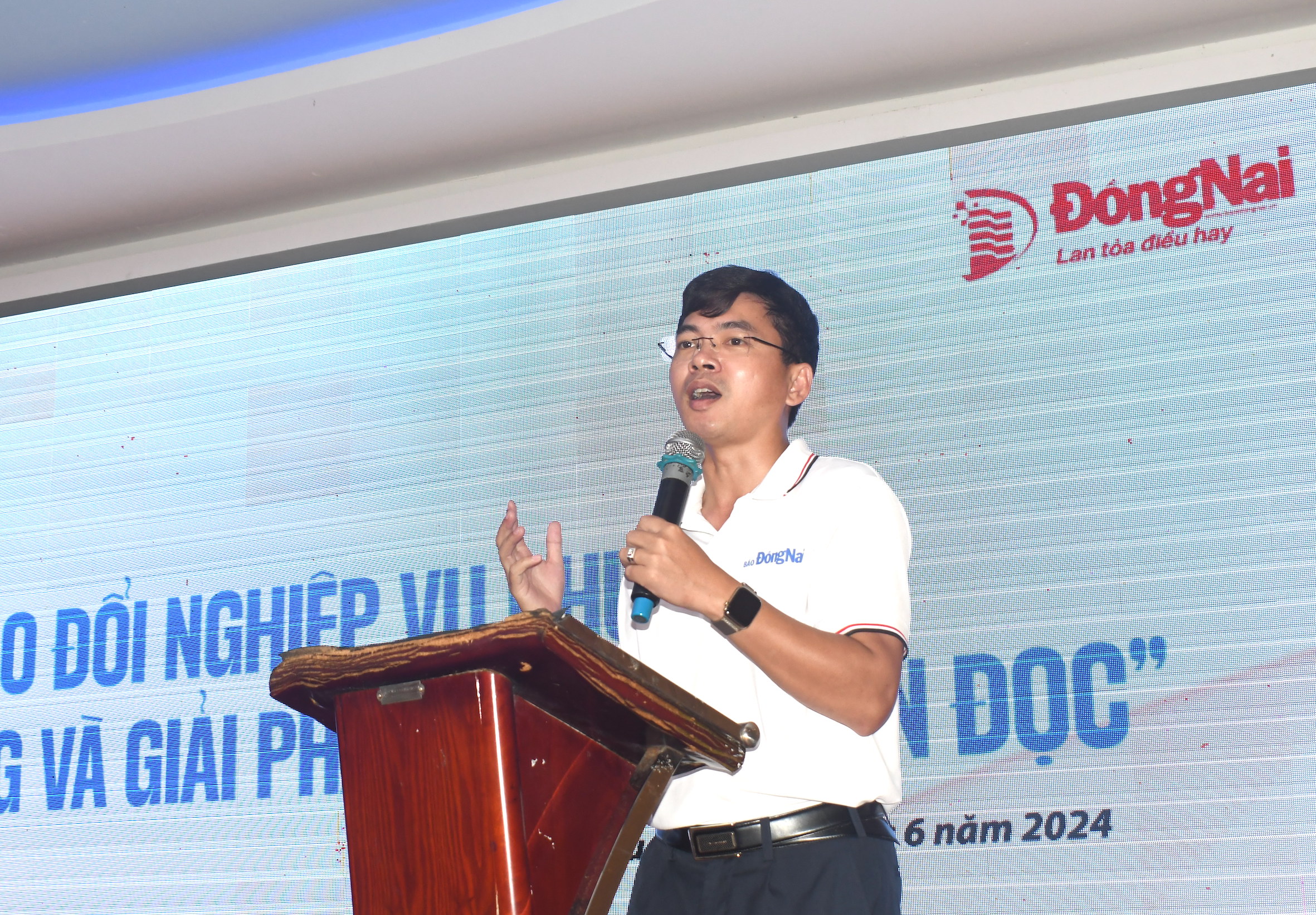 | Nhà báo Công Nghĩa, Báo Đồng Nai chia sẻ kinh nghiệm tác nghiệp tại hội thảo. |