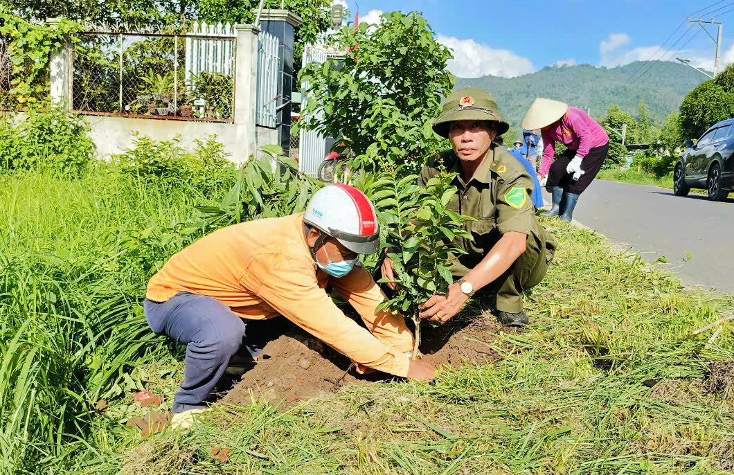 | Cán bộ, nhân dân trồng cây bằng lăng dọc tuyến đường tổ 3, ấp 4 xã Tóc Tiên nhằm tạo cảnh quan môi trường. |