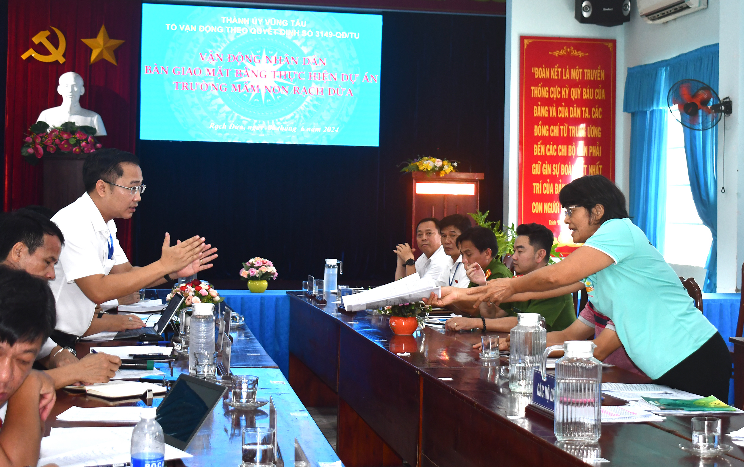 Chiều 6/6, Tổ tuyên truyền, vận động theo Quyết định số 3149/QĐ/TU Thành ủy Vũng Tàu (gọi tắt là Tổ tuyên truyền) do ông Lê Xuân Tú, Trưởng Ban Dân vận Thành ủy Vũng Tàu làm Tổ trưởng đã có buổi tuyên truyền, vận động người dân trên địa bàn phường Rạch Dừa bàn giao mặt bằng cho dự án Trường MN Rạch Dừa.