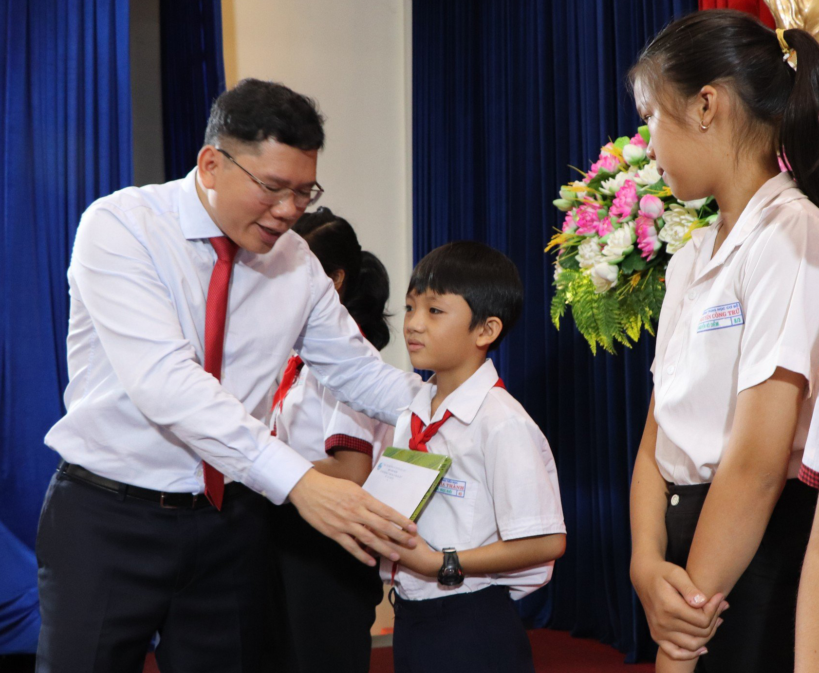 | Ông Hoàng Nguyên Dinh, Bí thư Huyện ủy Châu Đức tặng quà cho HS có hoàn cảnh khó khăn. |