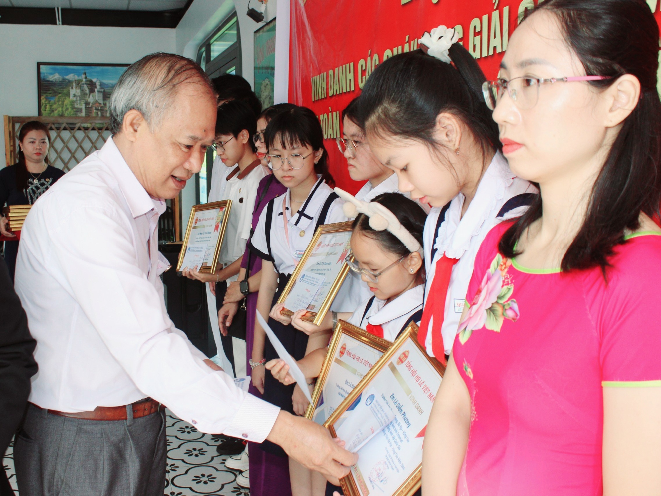 | Ông Lương Đức Đích, Chủ tịch Hội Khuyến học tỉnh khen thưởng các em học sinh có thành tích học tập xuất sắc. |