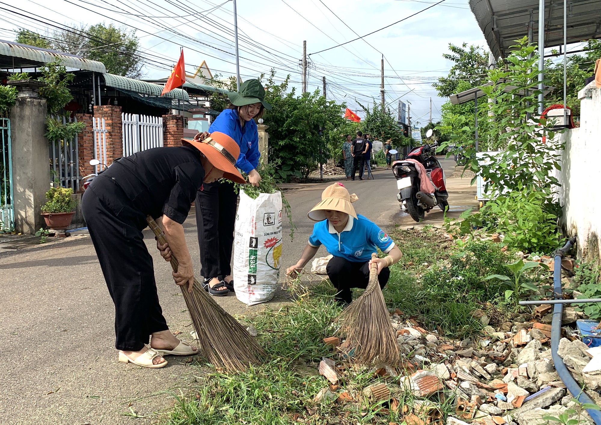 | Người dân tích cực quét dọn, thu gom cỏ, rác ở các khu dân cư. |