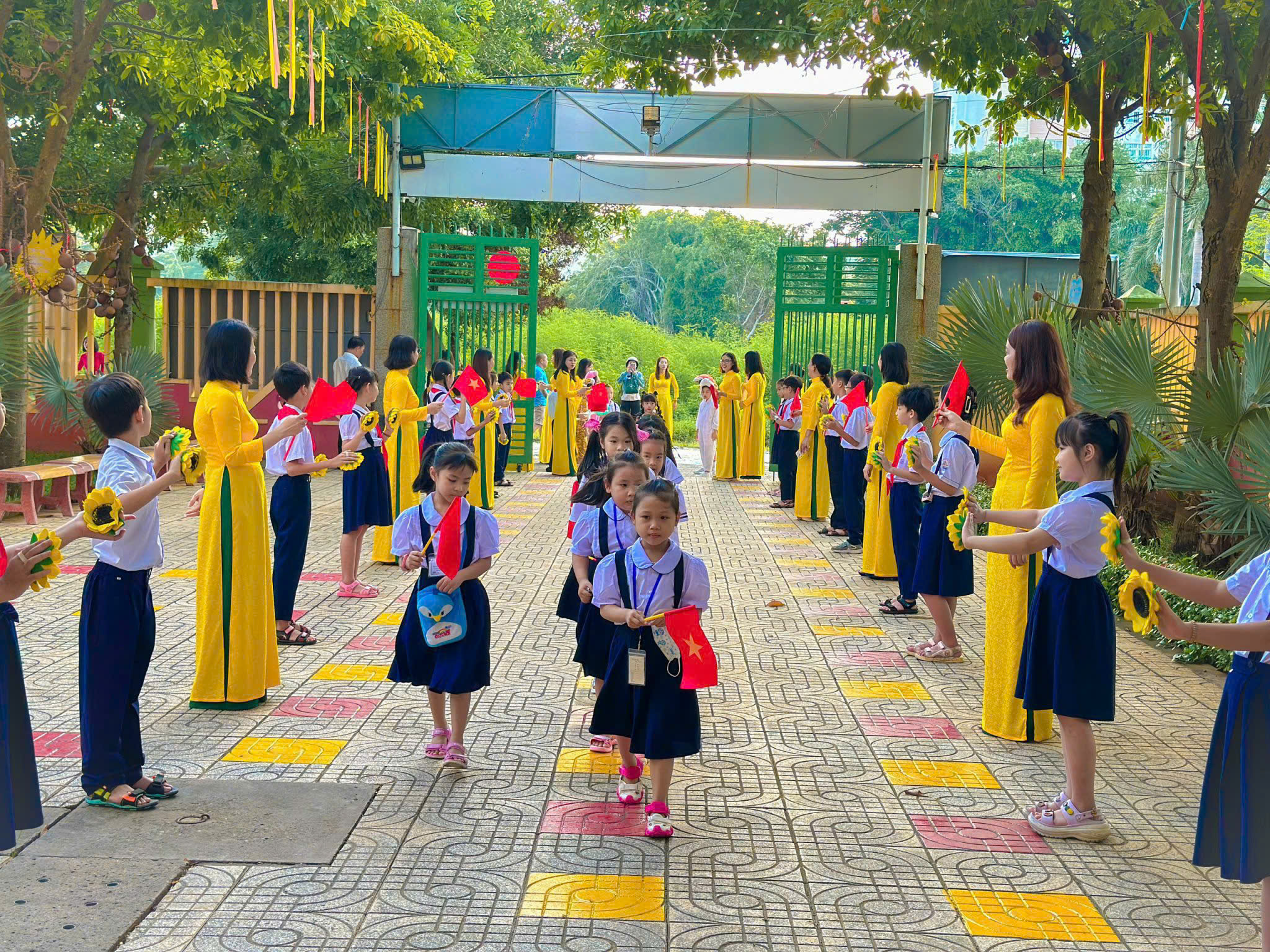 Trong ngày tựu trường, học sinh toàn khối gần như có mặt đông đủ, chỉ vắng 3 em có lý do chính đáng. Nhà trường bố trí các cô giáo đón các em từ cổng trường, GV chủ nhiệm đón các em tại lớp. Sau đó, các em tập trung tại sân trường để Ban Giám hiệu chào đón, giao lưu với các em.