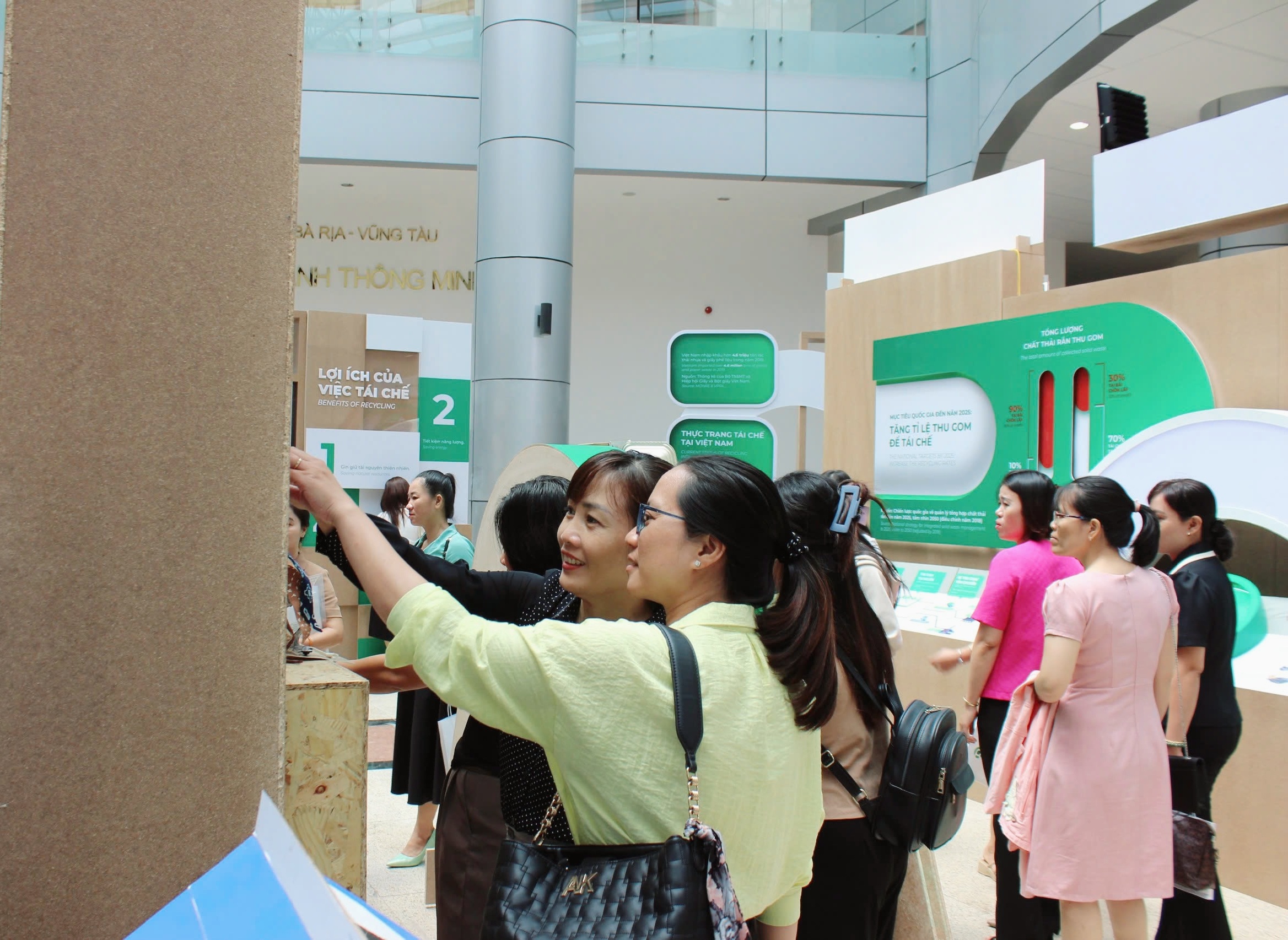 | Các đại biểu tham quan khu trưng bày sản phẩm tái chế. |