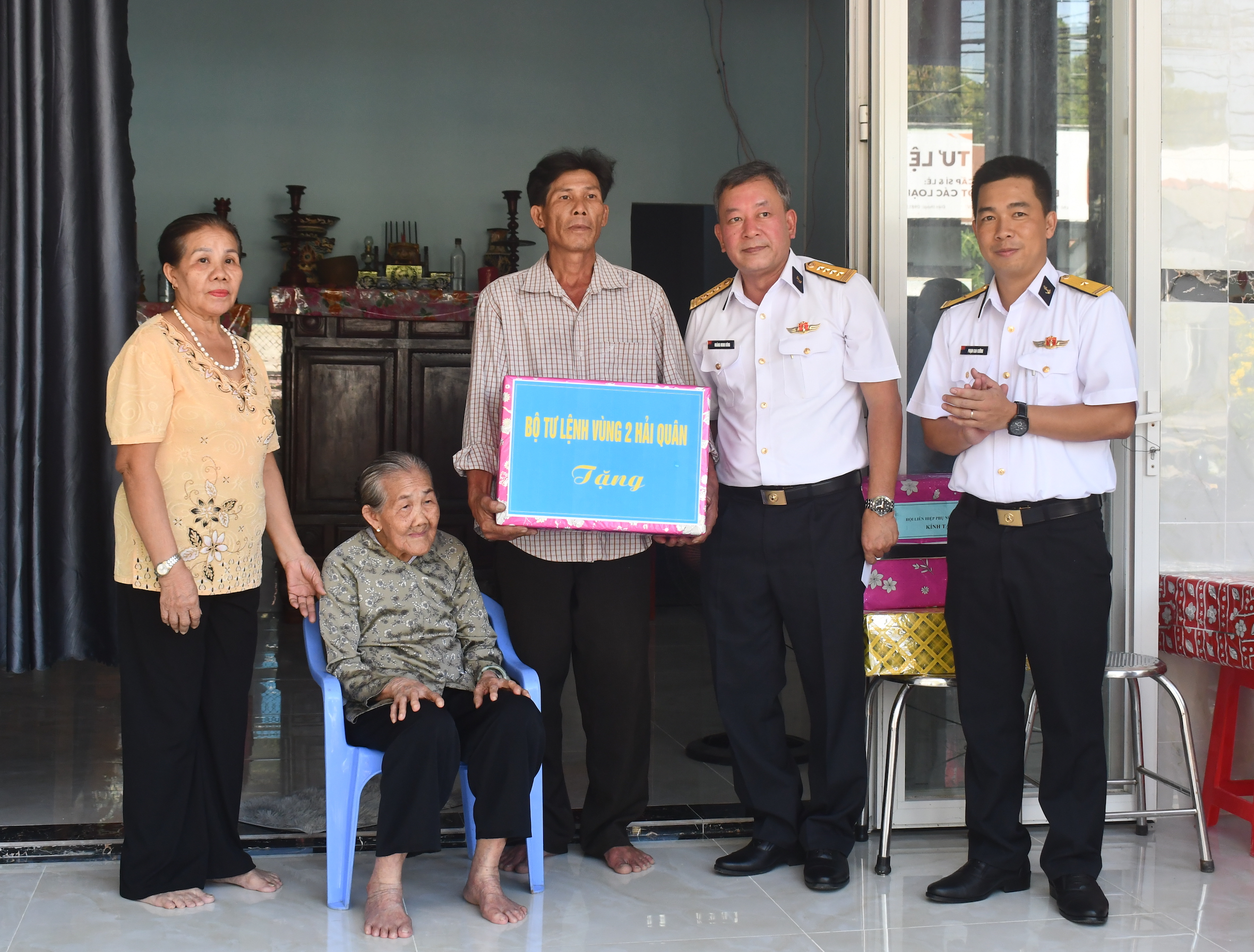 | Đại tá Hoàng Minh Dũng, Phó Chủ nhiệm Chính trị. Vùng 2 Hải quân trao quà đến gia đình bà Nguyễn Thị Tươi. |