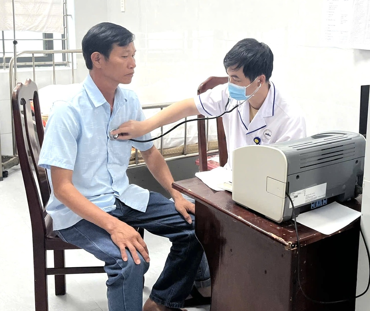 | Y sĩ Trần Xuân Minh (TYT xã Bình Châu, huyện Xuyên Mộc) khám bệnh cho người dân. |