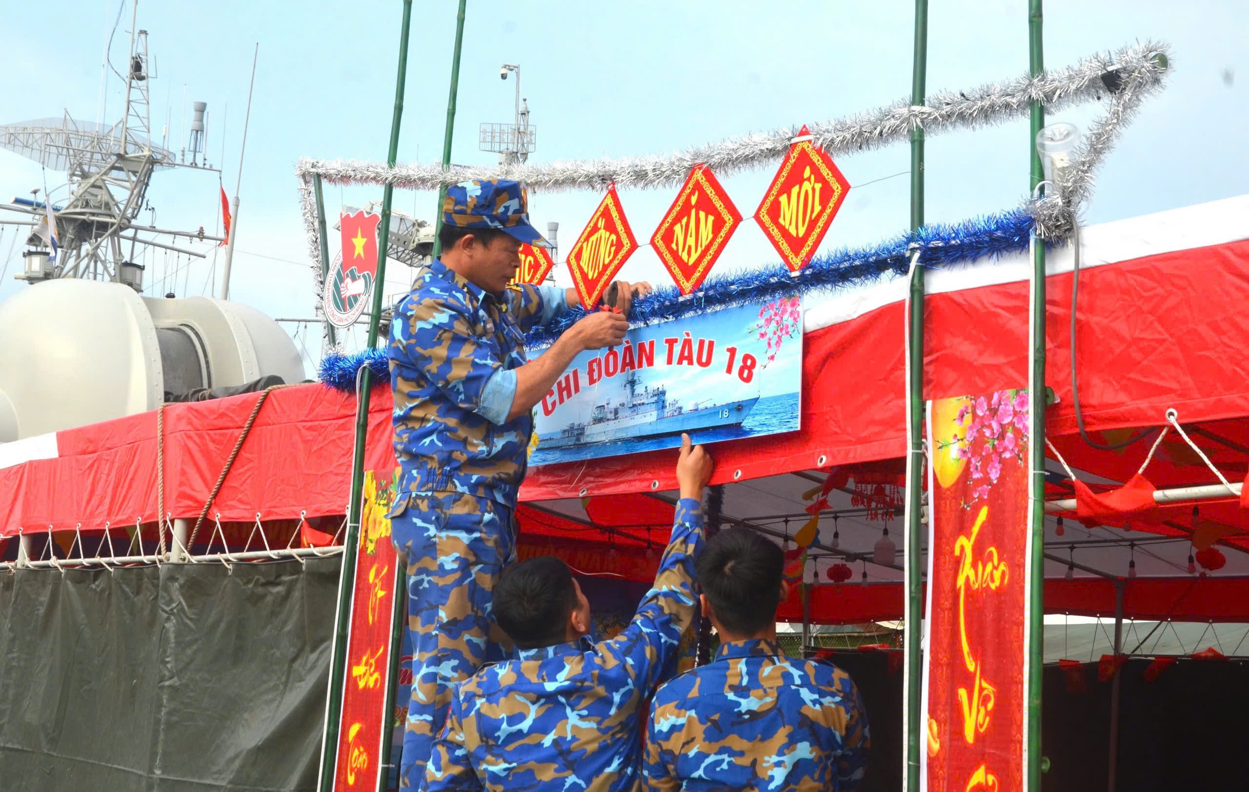 Ngoài hội thi bánh chưng, tại doanh trại Lữ đoàn 171, khuôn viên cũng được treo băng cờ, khẩu hiệu rực rỡ cùng các tiểu cảnh, vườn hoa xuân khoe sắc thắm. Tại các tàu hải quân cũng tổ chức trang trí bàn thờ Bác Hồ, tiểu cảnh, cổng chào để chào đón năm mới.