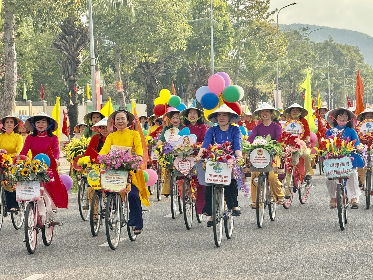 | Phụ nữ TT.Long Hải mặc áo dài diễu hành bằng xe đạp quanh một số tuyến đường của thị trấn. |