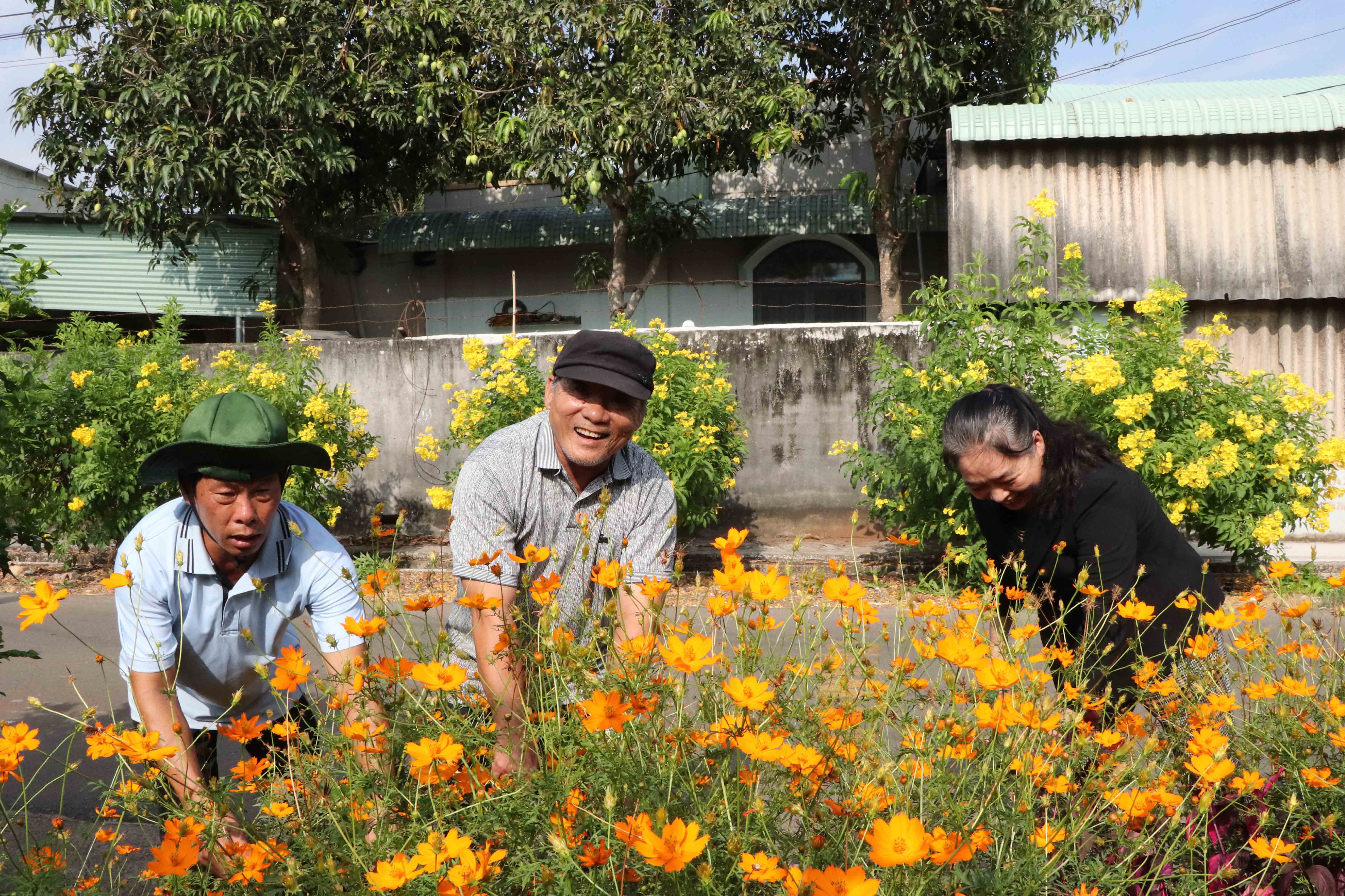 | Cán bộ, hội viên nông dân xã Nghĩa Thành chăm sóc các tuyến đường hoa. |